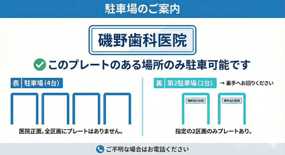 駐車場は歯科医院前表に4台あります 裏に第2駐車場2台 磯野歯科医院のプレートのある場所のみ駐車可能です
