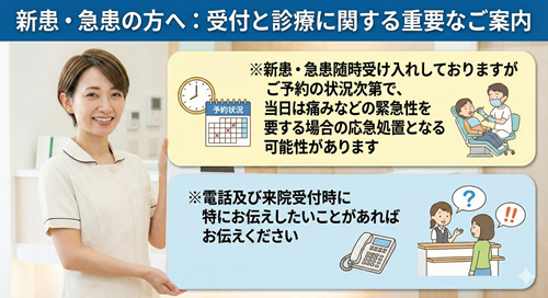 基本的に予約制となっておりますが、痛みが強い方や急ぎの処置を要すると医師が判断するものは予約外でも速やかに入っていただく可能性があります。